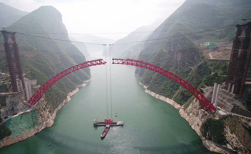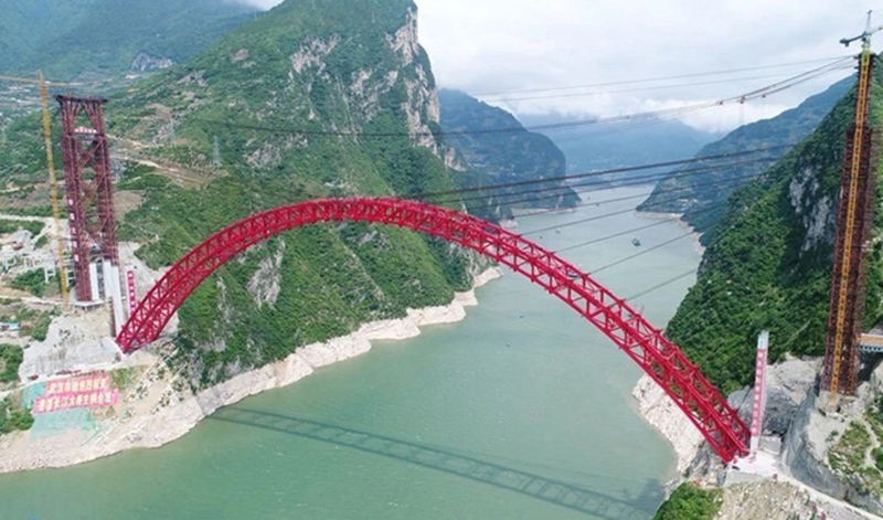 秭歸長(zhǎng)江大橋?yàn)橹谐惺戒撓滂旒芄皹?,主?31.2米,全長(zhǎng)883.2米,采用2×200噸纜索起重機(jī)安裝,2018年5月22日主拱合龍。
