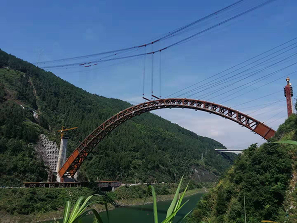 該橋為非對稱上承式鋼管混凝土拱橋,主跨292米,在同類型橋梁中居世界第一,采用跨度865米的2×150噸纜索起重機,在國內(nèi)首次實施兩片拱肋同時整節(jié)段吊裝,主拱于2019年7月31日合攏。