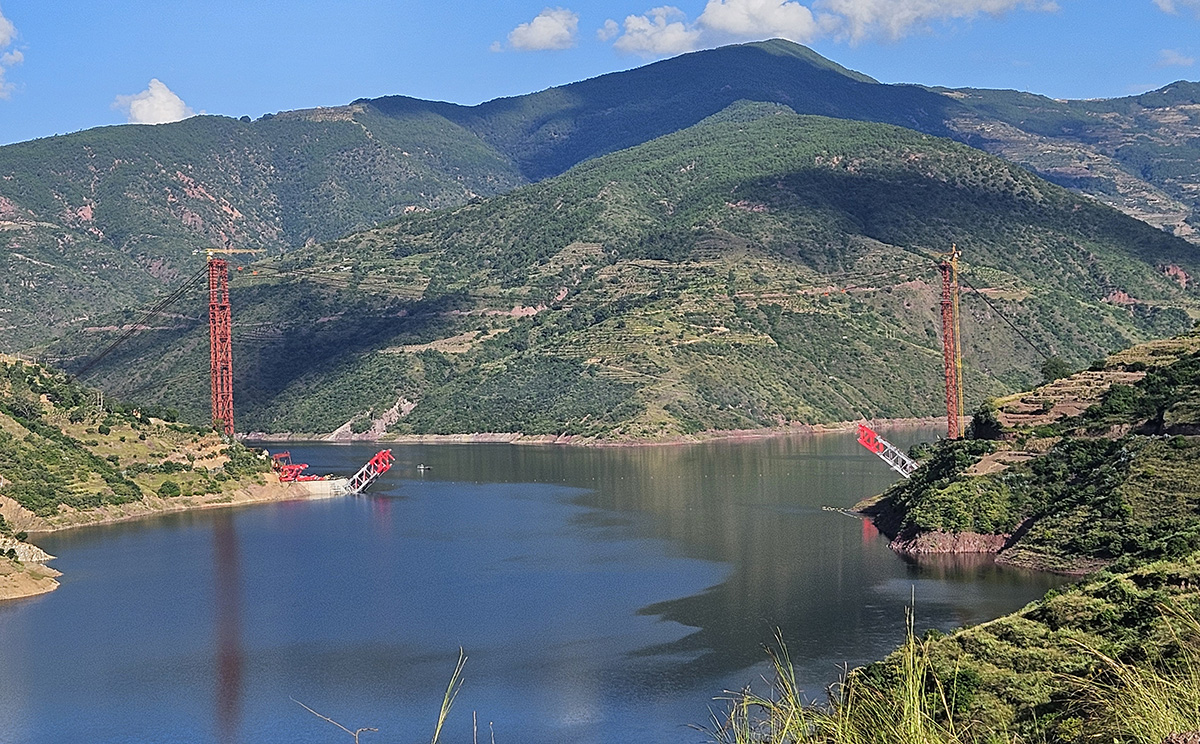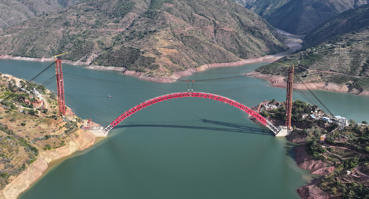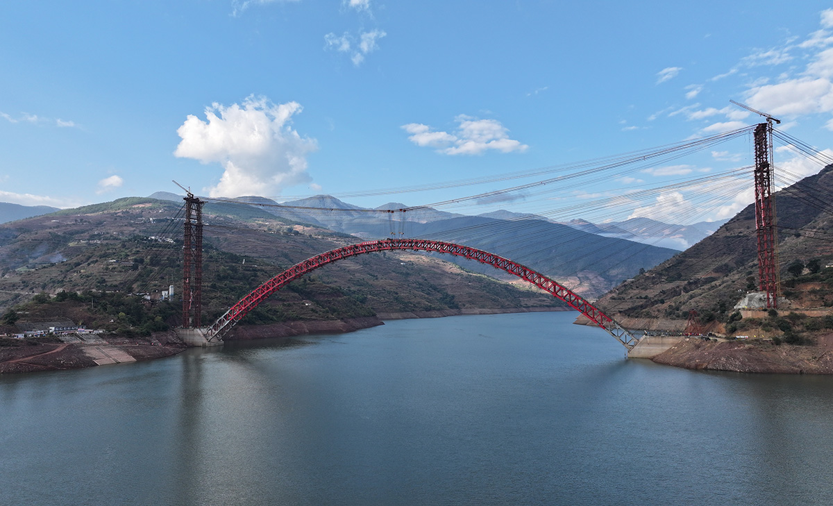 該橋為主跨390米的中承式鋼桁架提籃拱橋,全長546米,采用160t纜索起重機(jī)進(jìn)行安裝,2025年1月3日合龍。