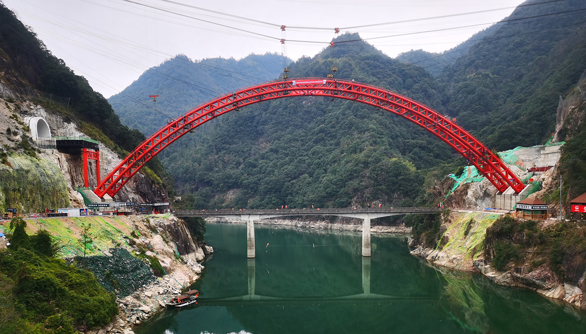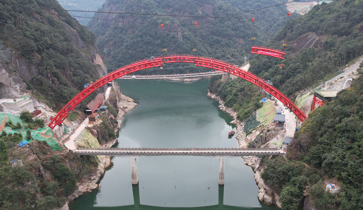 該橋為主跨152米的中承式鋼管混凝土拱橋,全長191.52米,采用2×40t纜索起重機進行安裝,2024年12月25日合龍。