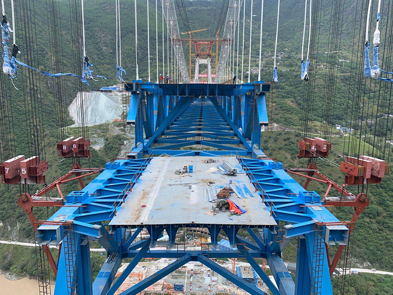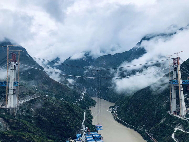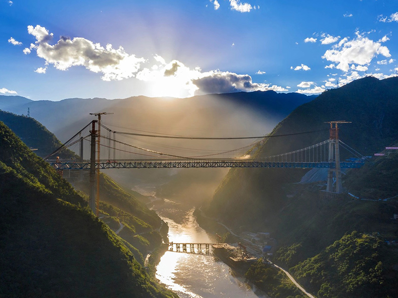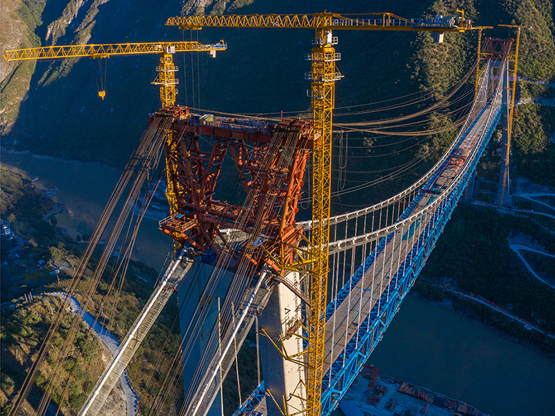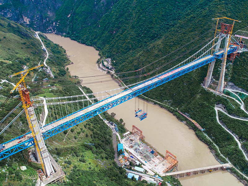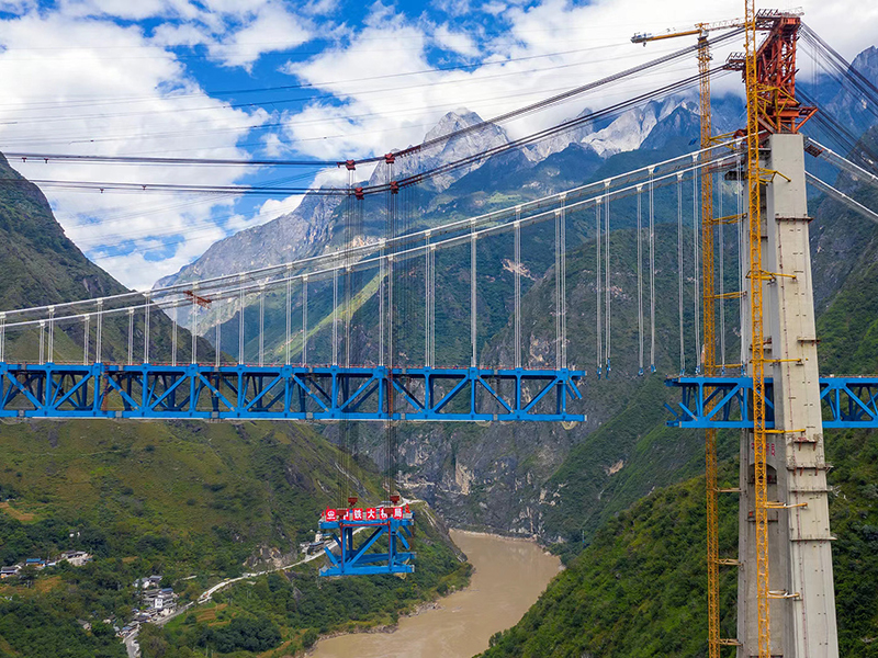 麗香鐵路是連接麗江與香格里拉的“天路”,金沙江特大橋是全線控制性工程。大橋全長882.5米,主跨達660米,橋面離江面垂直距離約250米。全橋由71個節(jié)間鋼桁梁拼裝組成,單片最大鋼桁梁重量達640噸,采用最大吊重800噸的纜索起重機進行起重吊裝。該橋于2020年11月13日順利合龍。