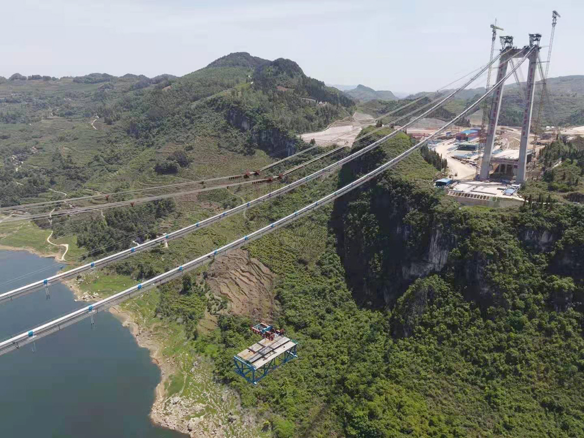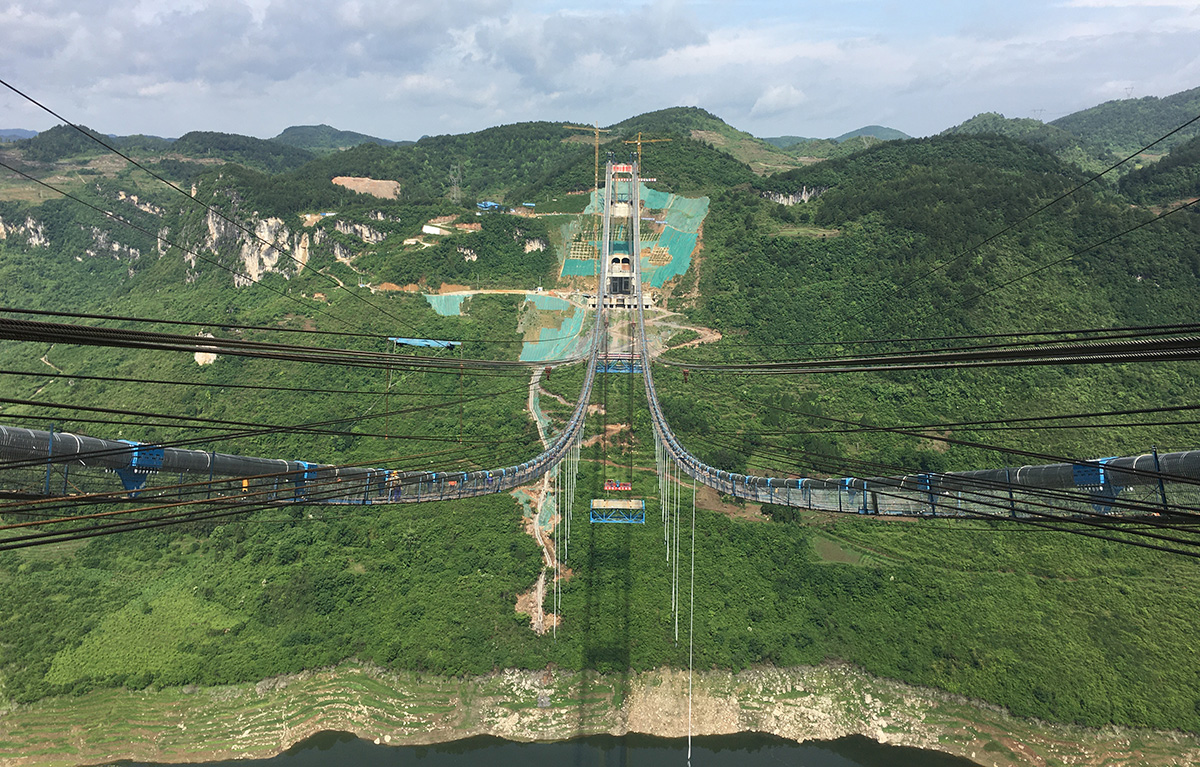 甕開高速開州湖特大橋,為主跨1100米的雙塔單跨鋼桁梁懸索橋,全長1257米,主塔高139米。采用2×125噸纜索吊進行安裝,于2021年8月17日合龍。