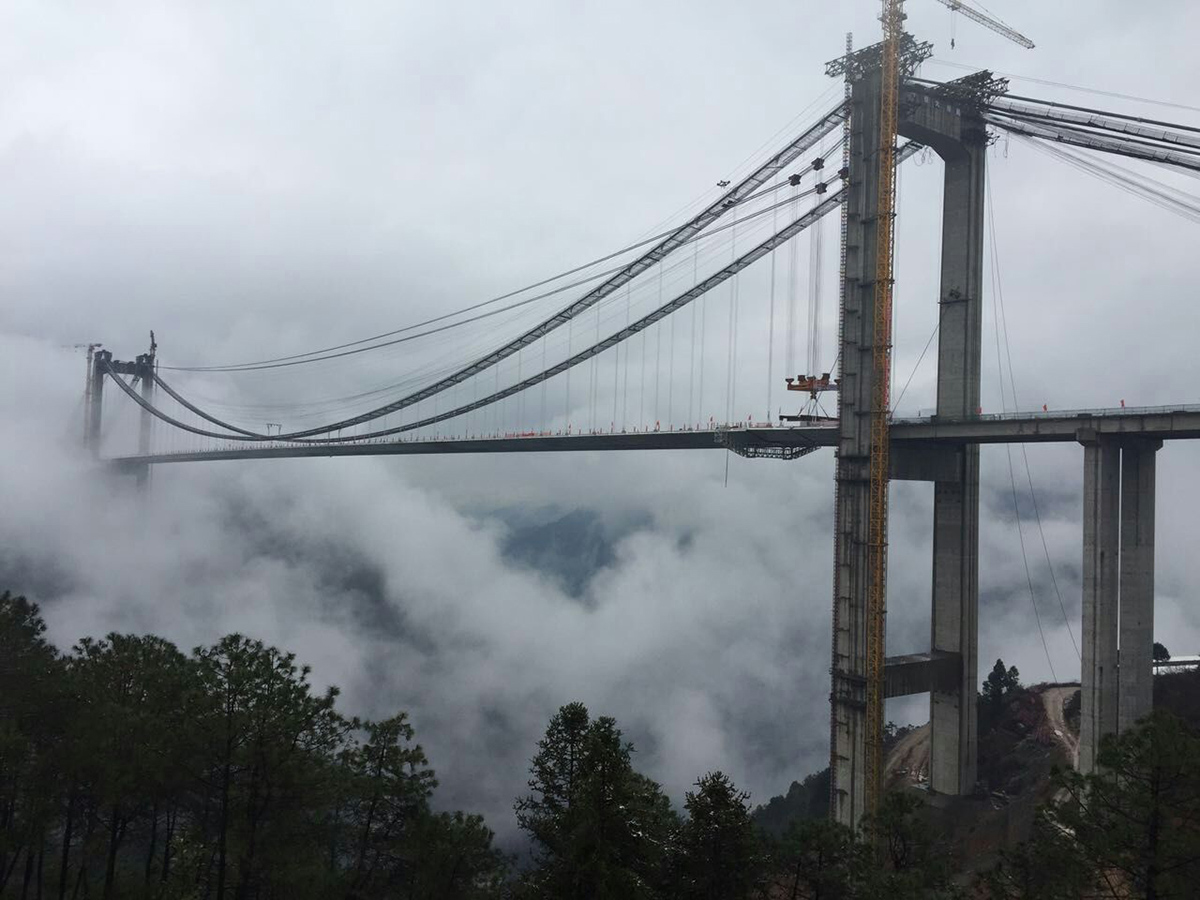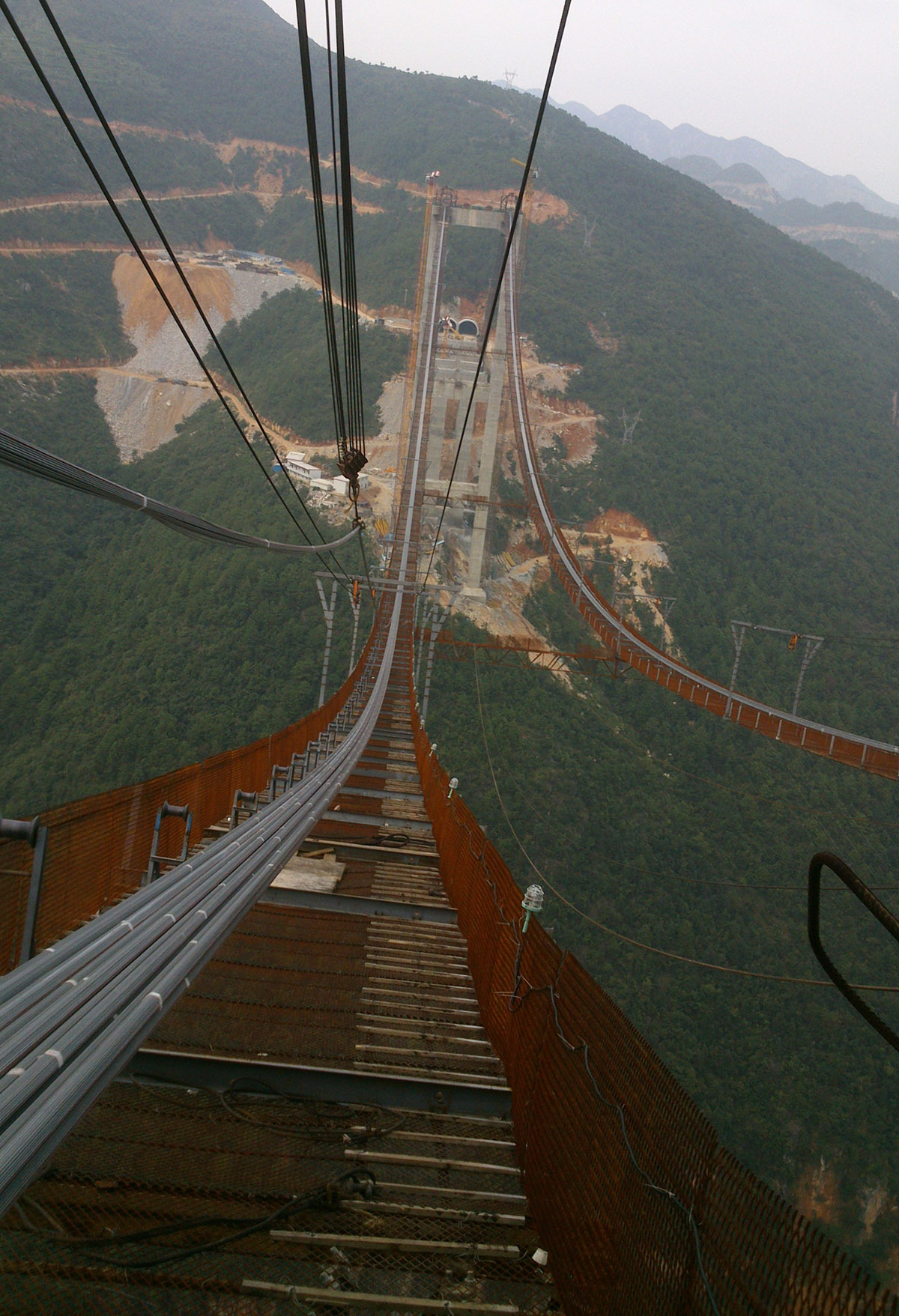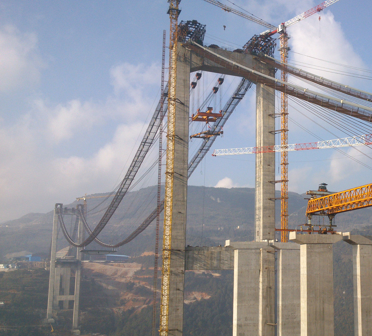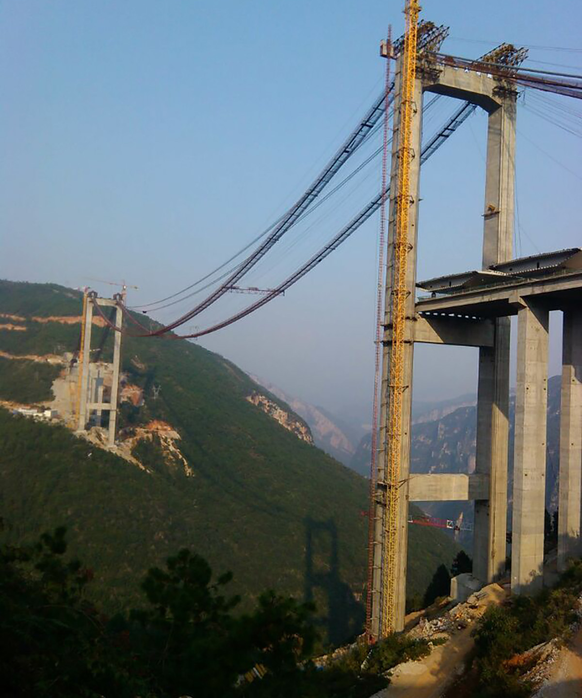 普宣高速普立特大橋,橋長1290米,主橋628米,為雙塔單跨鋼箱梁懸索橋。該橋采用250噸纜索起重機進行鋼梁架設,并首次應用公司研發(fā)的旋轉吊鉤對構件空中姿態(tài)進行自由調整,為山區(qū)懸索橋開辟了新的鋼梁架設方法。