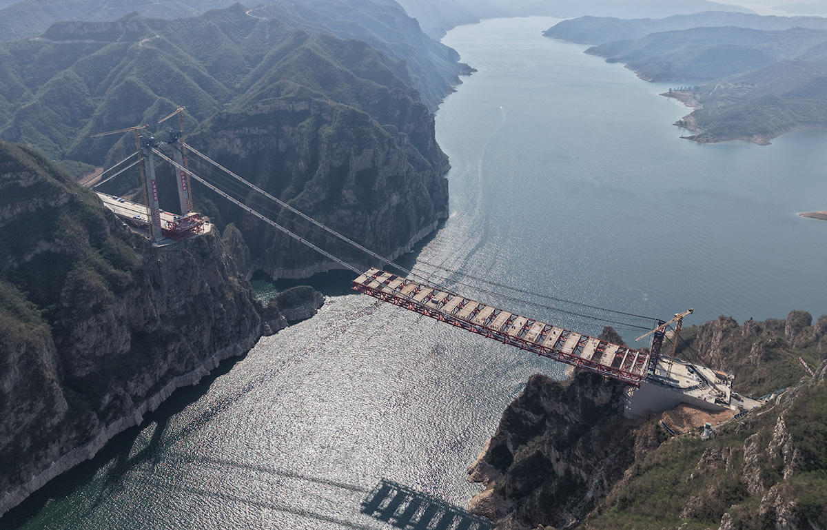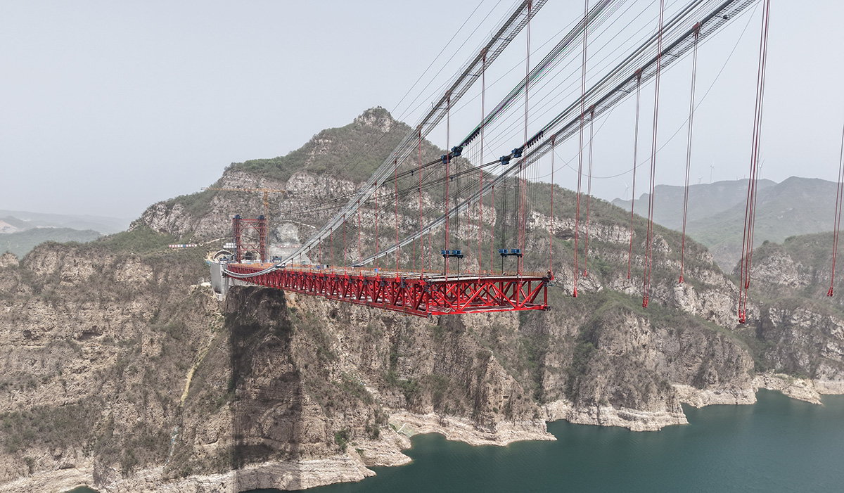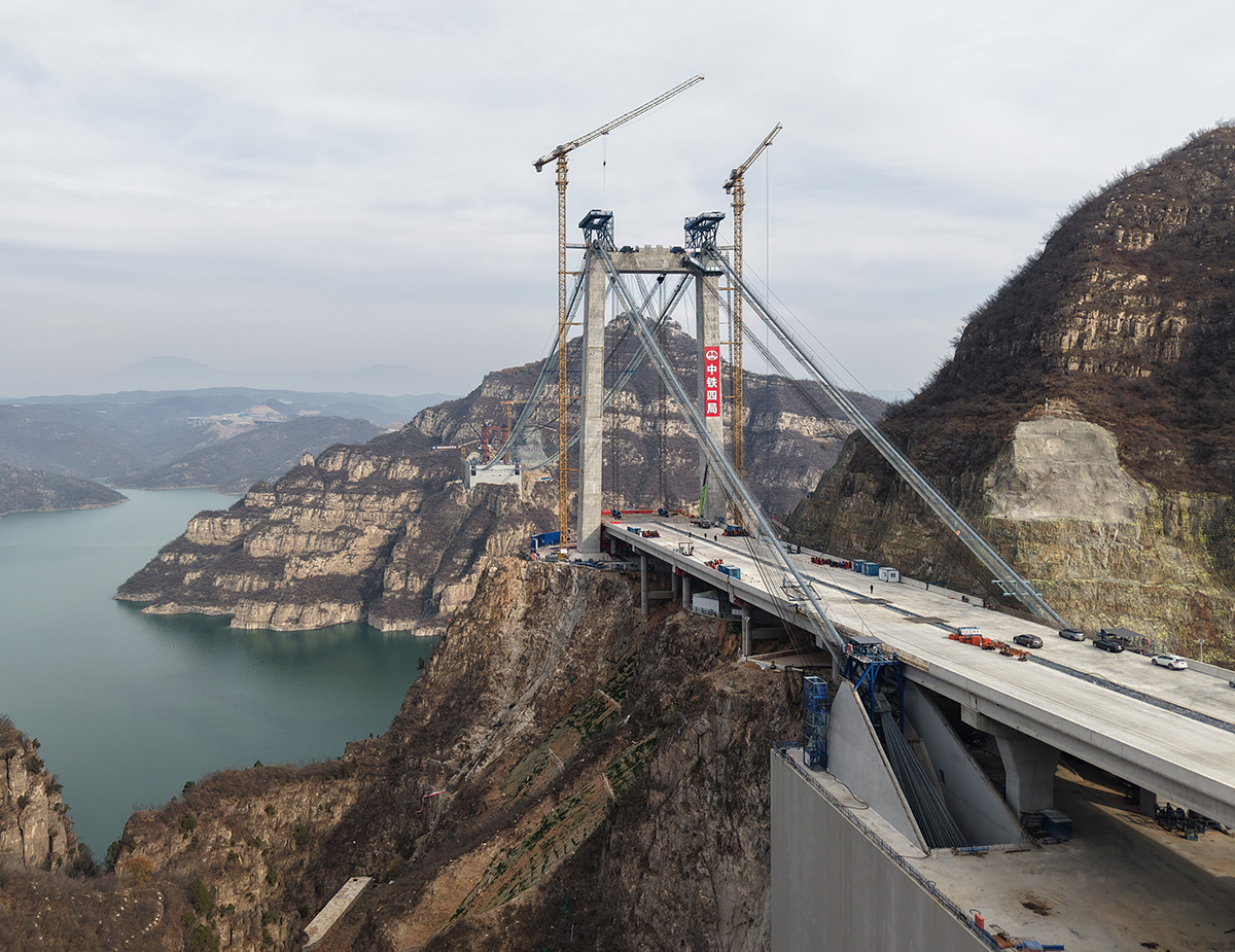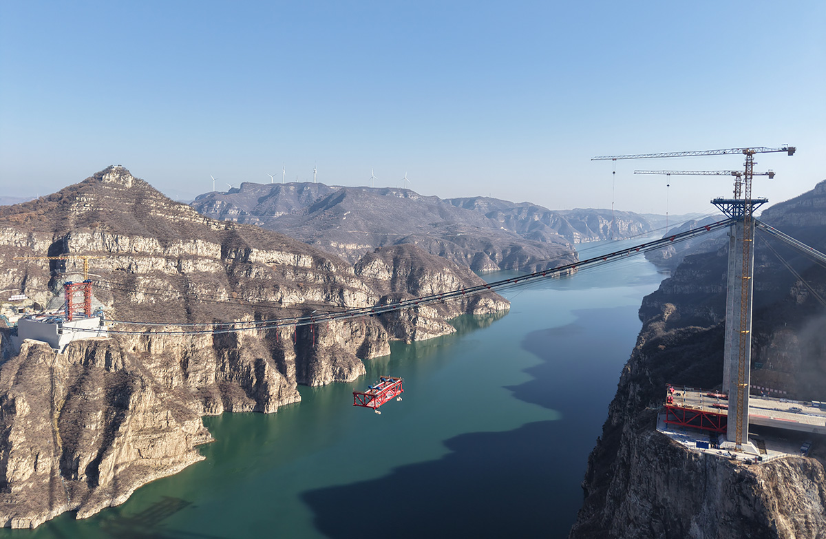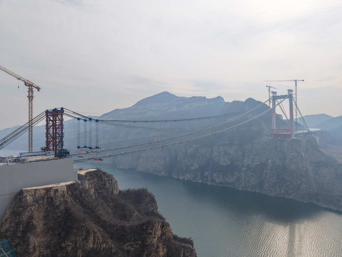 該橋?yàn)橹骺?55米的獨(dú)塔單跨地錨式回轉(zhuǎn)纜懸索橋,全長(zhǎng)1688.5米,采用2×145t纜索式起重機(jī)進(jìn)行安裝,2025年6月10日合龍。