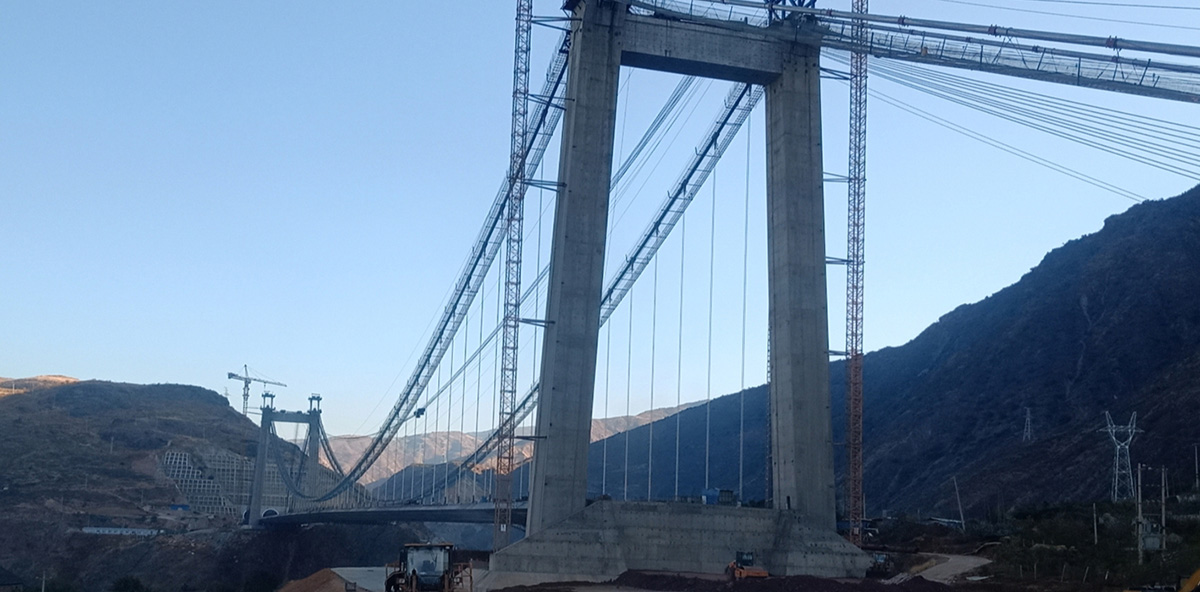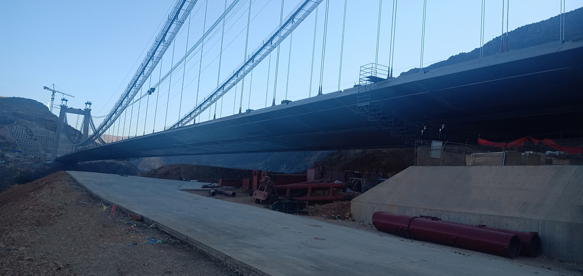 該橋?yàn)閱慰玟撓淞簯宜鳂?,主?36米,采用2×85t纜索起重機(jī)安裝,2019年12月31日合龍。